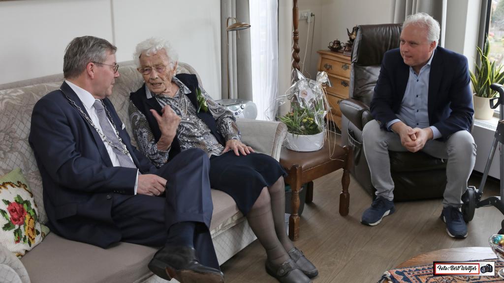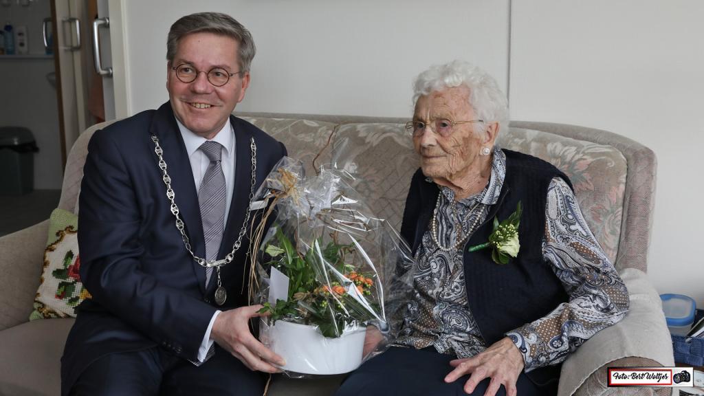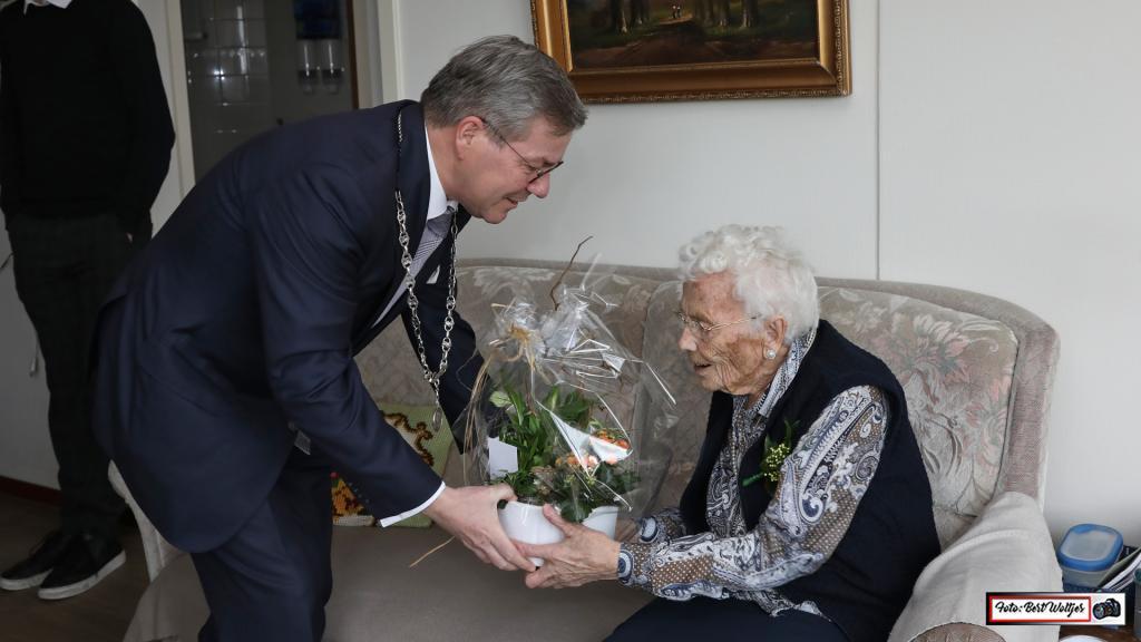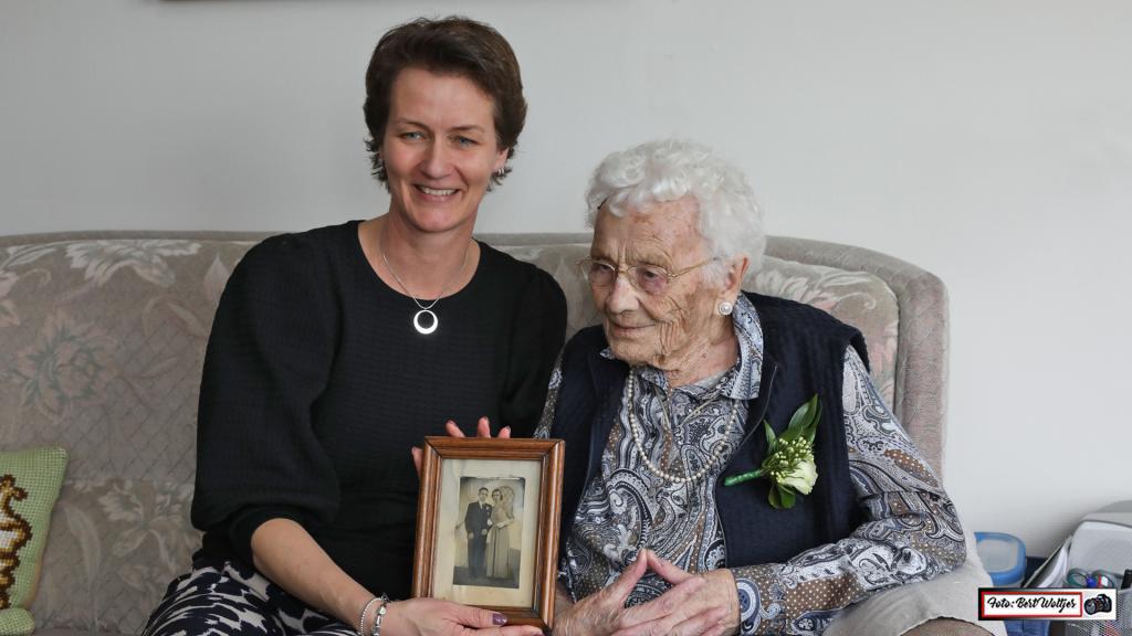 Vandaag, Woensdag 22 maart, vierde mevr. Dinie Siepel-Dodde het feit dat ze 104 jaar is geworden. Het feest werd gevierd in het AG Wildervanckhuis waar ze inmiddels al weer 14 jaar woont en voordien woonde ze nog zelfstandig in Nieuwe Pekela op verschillende adressen. Burgemeester Berry Link kwam op bezoek, vergezeld van een grote bos bloemen.