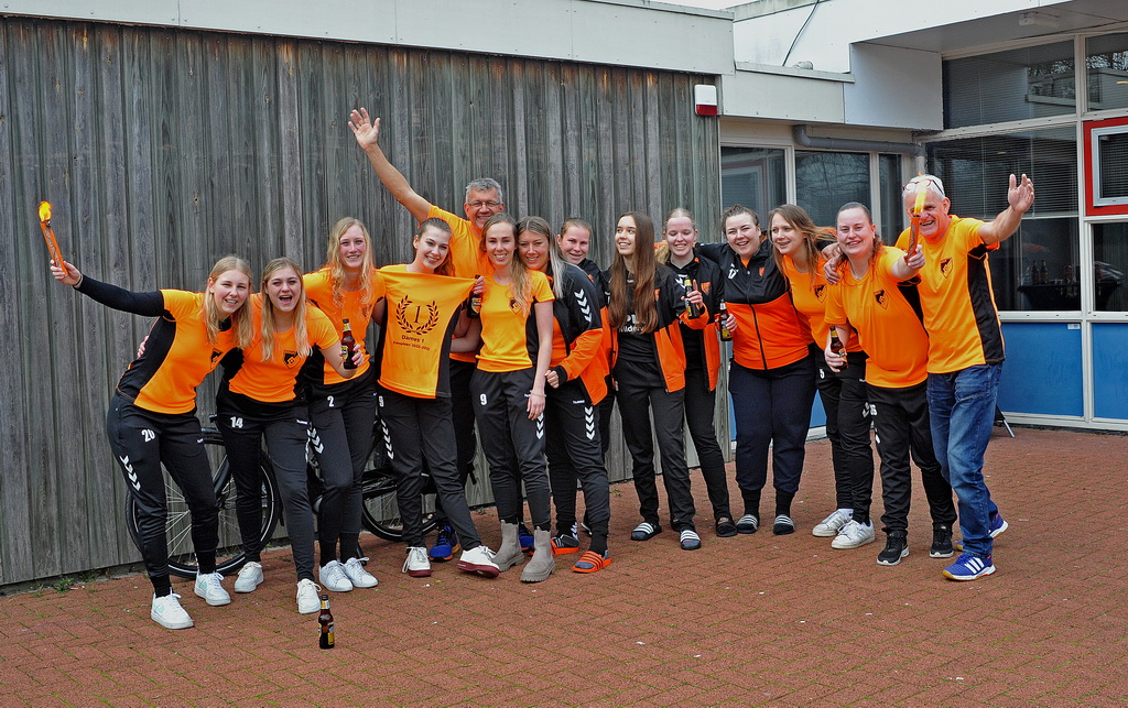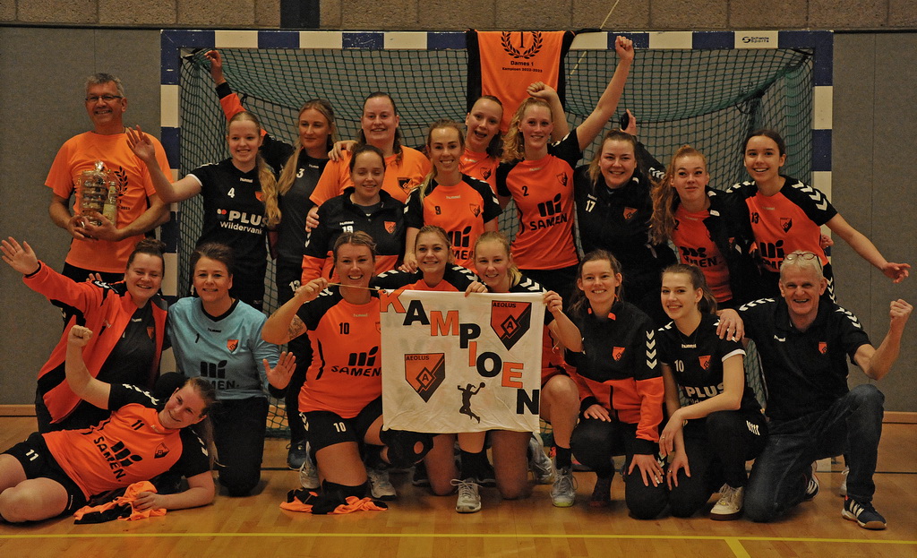 Maar zoals wel vaker dit seizoen richtte de thuisploeg zich weer eens op in de slotfase van de wedstrijd. Met een kleine omzetting in de ploegbezetting en een geweldige wedstrijdmentaliteit knokte de ploeg voor wat het waard was. De dekking stond geen enkel doelpunt meer toe en aan de andere kant wist men met een handvol fraaie treffers het spelbeeld te laten kantelen. Bij het laatste fluitsignaal van de prima leidende scheidsrechter Andries Meter, en een eindstand van 20-18 op het scorebord, brak in de hal een pandemonium los. Aeolus pakte twee ronden voor het einde van de competitie het kampioenschap en mag de blik gaan richten op de 1e klasse.