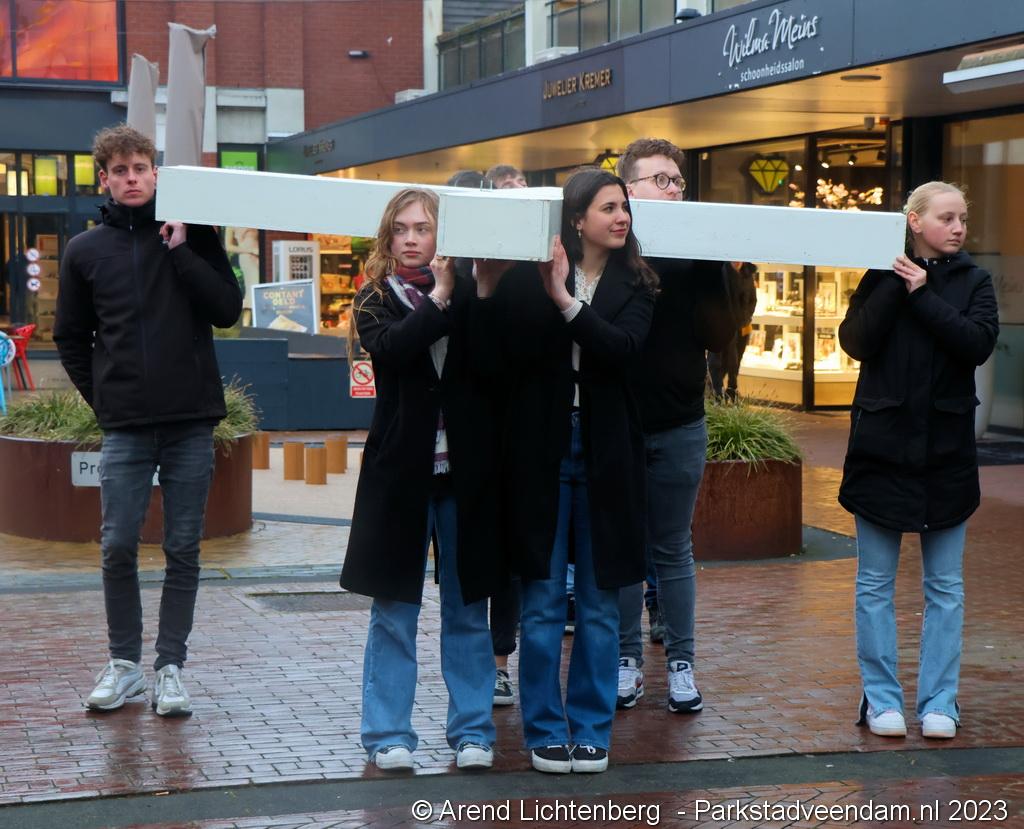 Vandaar ging een groep van circa 150 mensen een grote processie starten met een groot wit kruis door het centrum van Veendam. Ook dit jaar werden de deelnemers tijdens de route meegenomen in het verhaal van de lijdensweg van Christus.