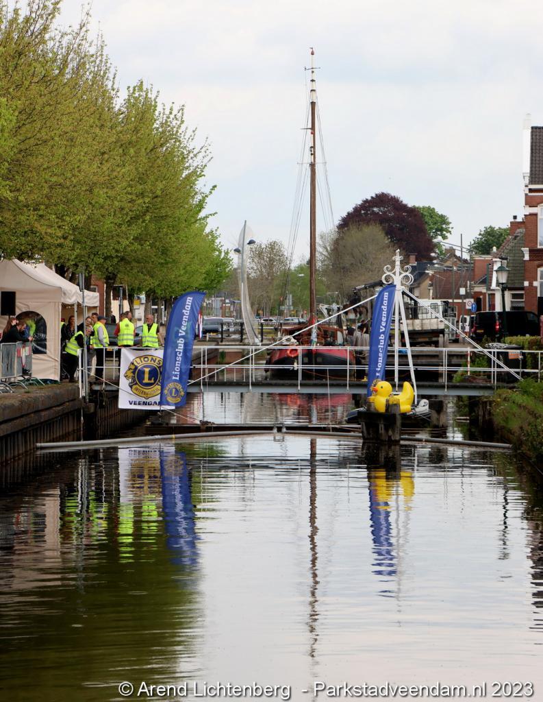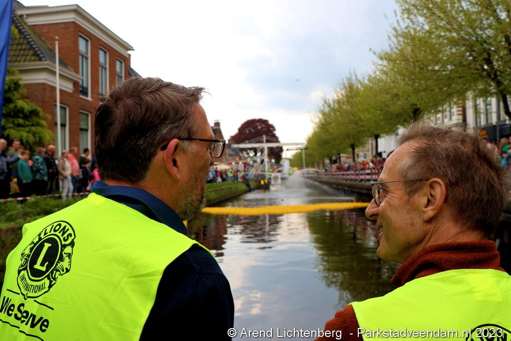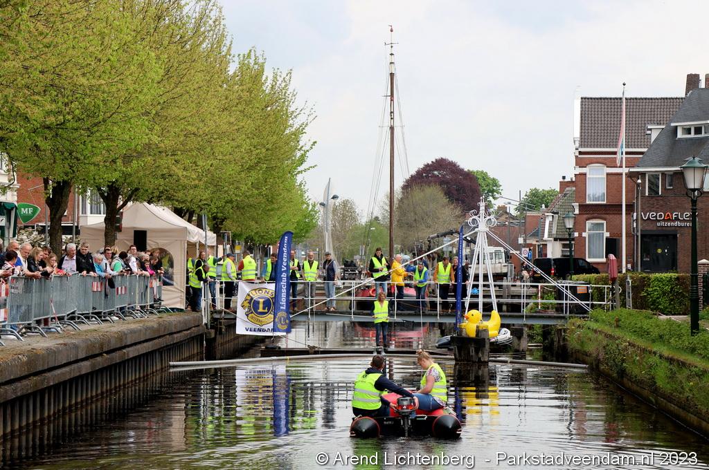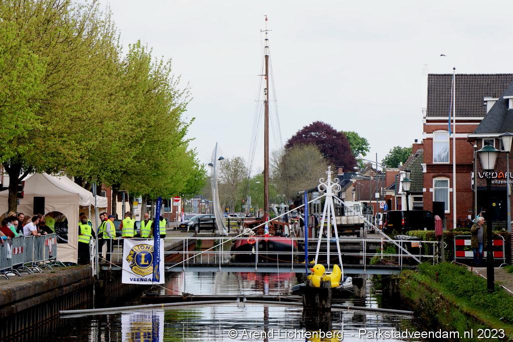 Met ondersteuning van waterspuiten van de brandweer Veendam dobberden de badeendjes richting de Hazepadbrug. Tijdens de race overhandigde de president van de Lionsclub Hans Deuze symbolisch enkele zonnepanelen en een duurzame energievoorziening aan het bestuur van Bubble.