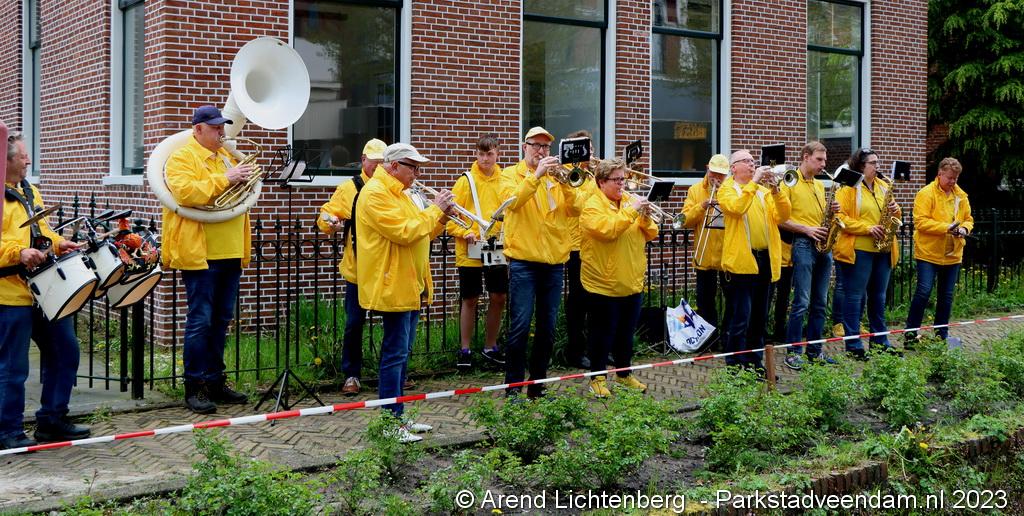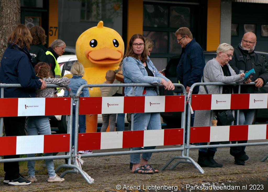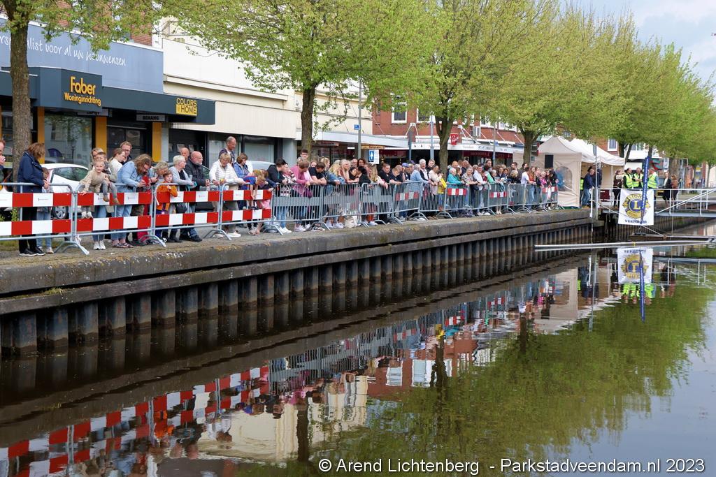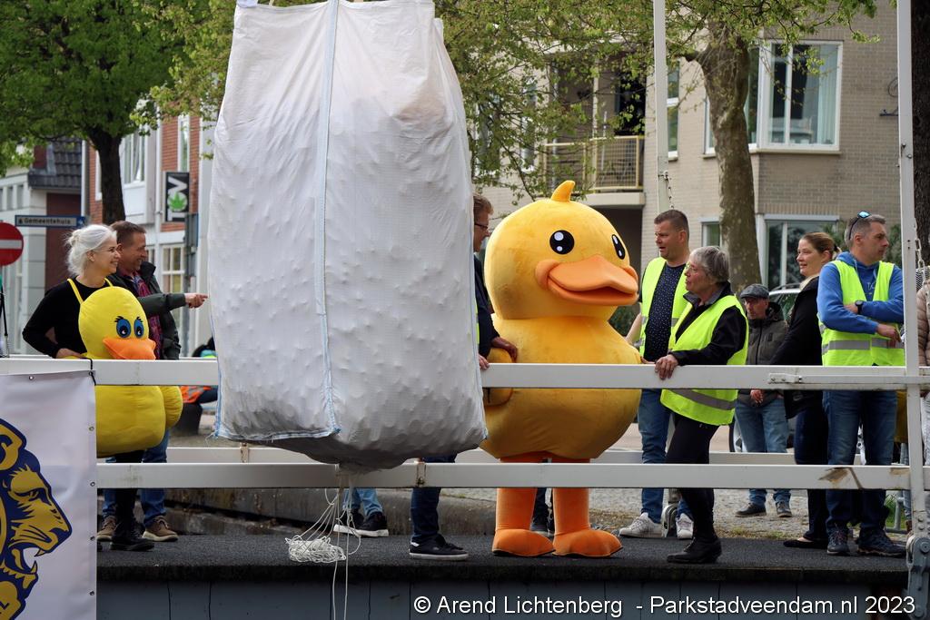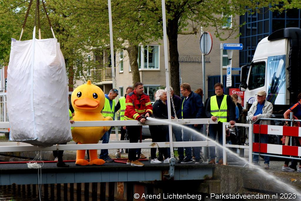 Met ondersteuning van waterspuiten van de brandweer Veendam dobberden de badeendjes richting de Hazepadbrug. Tijdens de race overhandigde de president van de Lionsclub Hans Deuze symbolisch enkele zonnepanelen en een duurzame energievoorziening aan het bestuur van Bubble.