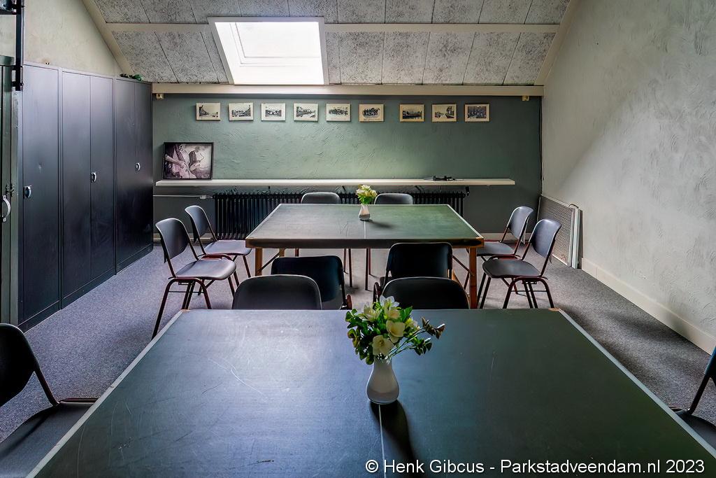 Boven is eerst een stijlvolle nieuwe vergaderruimte met 2 grote tafels met ieder 8 stoelen. Het klussenteam met medewerking van verschillende andere vrijwilligers zijn weken in de weer geweest om dit te realiseren. “Het was een soort open vide, die erg veel energie opslokte,” vertelt Hein in ’t Hout, voorzitter van de Stichting. “We hebben nu deze vergaderruimte gemaakt en dat scheelt ons aanzienlijk in de stookkosten!” Aan de wand een levensechte foto van Zuudwenden van vroeger met de oude school, nu dorpshuis.