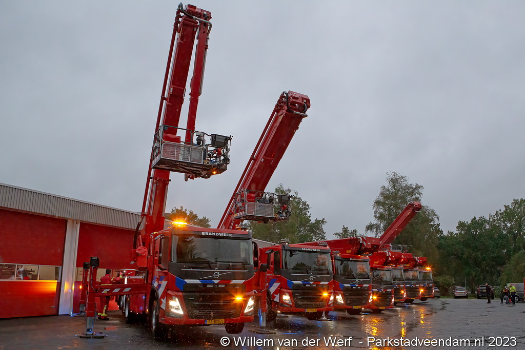 Vandaag presenteerde brandweer Groningen bij de brandweerkazerne in Veendam de zeven nieuw aangeschafte hoogwerkers. De nieuwe hoogwerkers worden gestationeerd op de kazernes Hoogezand, Stadskanaal, Winschoten, Delfzijl, Groningen-Vinkhuizen en Groningen-Sontweg.