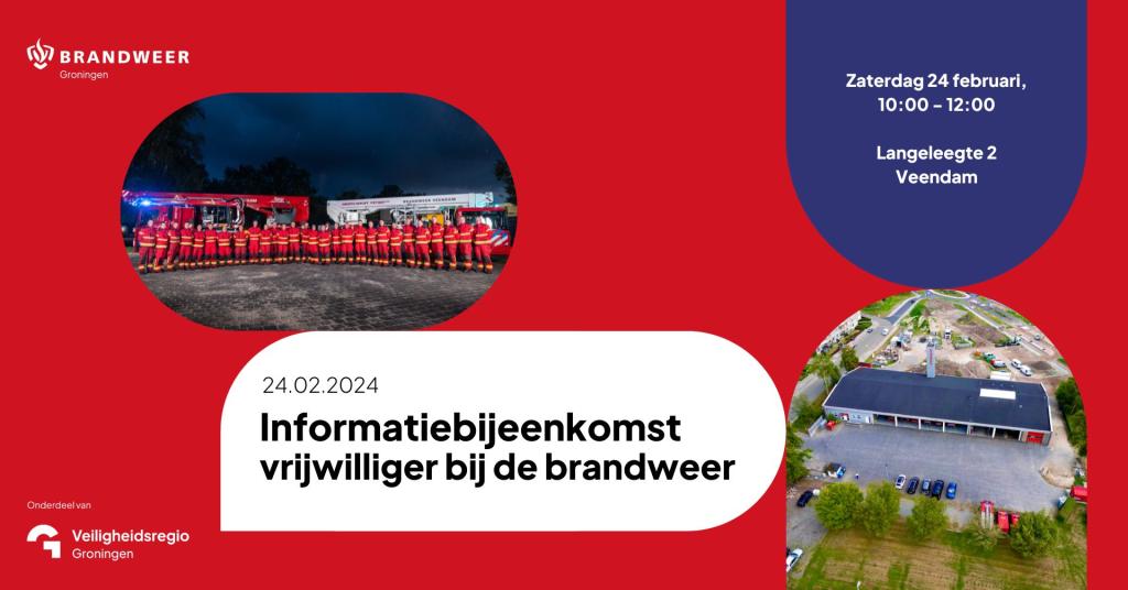 Brandweer Veendam zoekt nieuwe vrijwilligers! Woon jij binnen een straal van 5 minuten van de kazerne? En lijkt het jou leuk om als vrijwilliger aan de slag te gaan bij de brandweer in Veendam? Meld je dan aan voor informatiebijeenkomst op zaterdag 24 februari 2024.
