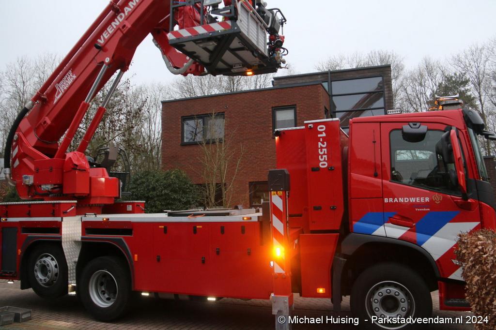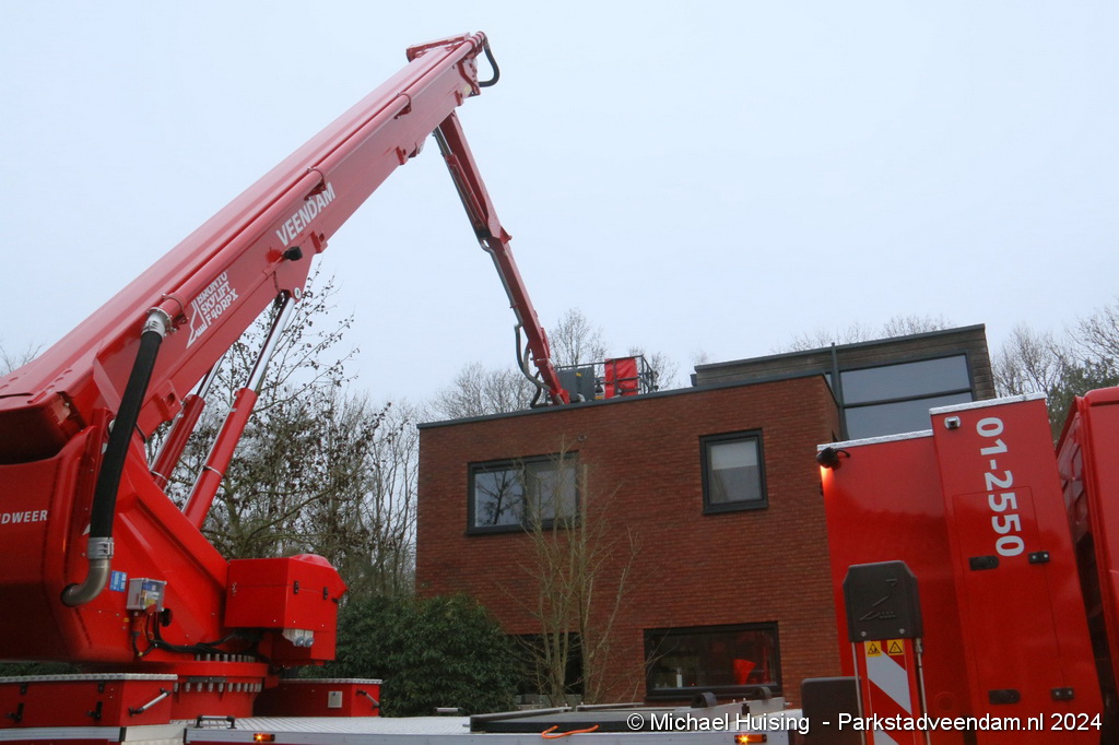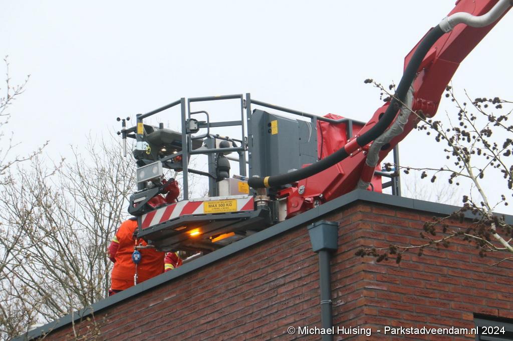 De hoogwerker werd opgesteld om een controle uit te voeren vanaf het dak. Ook binnen werd de situatie veiliggesteld. Naar het zich liet aanzien viel het erg mee en was het gevaar snel geweken.