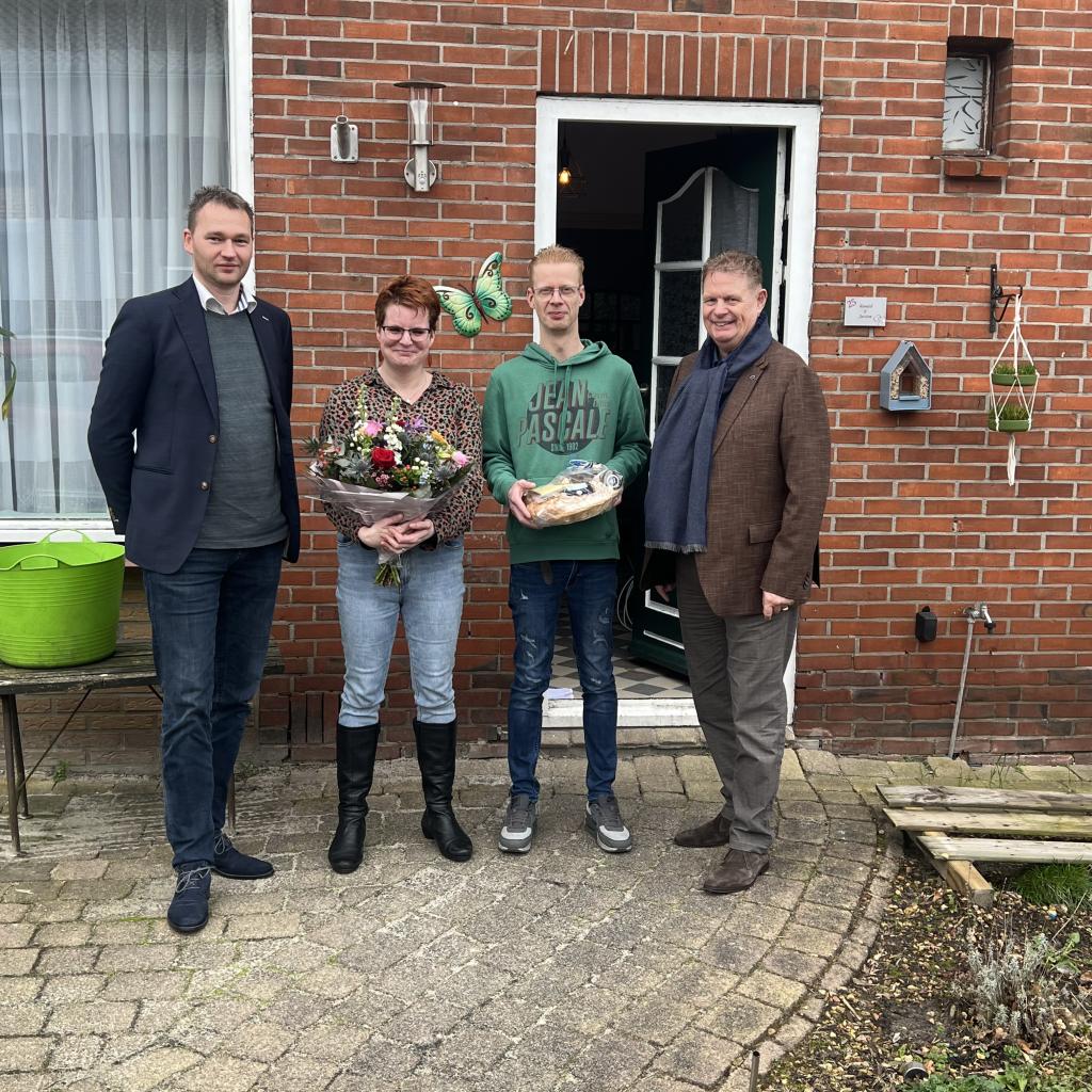 H. van Veenen (links) van Glasvezel Pekela overhandigde naast de felicitaties, ook een mand met lekkernijen en een bos bloemen.