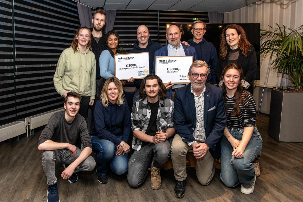 De studenten werden begeleid door Esmeralda van Boon en Laura Stoelwinder van Noorderpoort om samen een goed doel te vinden dat voldeed aan de gestelde kaders. Na het ochtendprogramma gingen de studenten in gesprek met leden van de Rotary waarbij uiteindelijk twee doelen in aanmerking kwamen voor een donatie. De studenten waren hierbij volledig in the lead en hebben ook de verdeelsleutel voor het bedrag per doel bepaald. Dayanara Dam is al vele jaren betrokken bij de KFW en zij pleitte zo gedreven en vurig dat de KFW de anderen ook overtuigd waren. De andere ‘winnaar’ is de stichting Rikki die kinderen met vrijwilligers in contact brengt om hen een goede tijd te geven, www.stichtingrikki.nl.