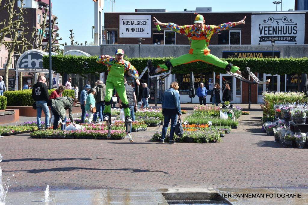 Op het Veenlustplein, voor het Raadhuisplein en bij het Kerkplein stonden ze met een gevarieerd aanbod in het centrum. Een heus springstelten duo was aanwezig om het geheel te omlijsten.