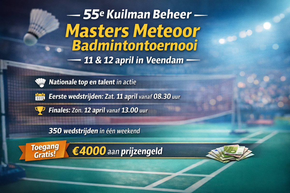 De Sorghvliethal in Veendam is op 11 en 12 april het toneel van de 55e editie van het Kuilman Beheer Masters Meteoor badmintontoernooi. Het toernooi maakt deel uit van het landelijke Master Circuit van Badminton Nederland en trekt opnieuw nationale topspelers en talenten naar Veendam voor een weekend vol sportieve strijd. Hoewel een deel van de Nederlandse top in dezelfde periode in Spanje uitkomt voor het Europees kampioenschap, verwacht de organisatie een sterk en aantrekkelijk deelnemersveld. Toernooileider Henriette van Delden geeft aan trots te zijn dat het toernooi opnieuw onderdeel is van het nationale circuit en benadrukt dat dankzij een grote groep vrijwilligers een sportief en goed georganiseerd weekend mogelijk wordt gemaakt.