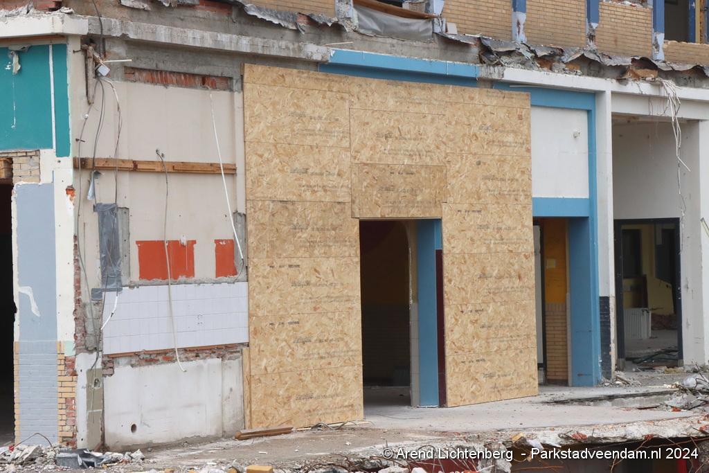 Eind mei werd er aan de voor- en achterzijde muliplexplaten tegen de muurschilderingen gezet om beschadiging te voorkomen tijdens de sloop van het gebouw.
