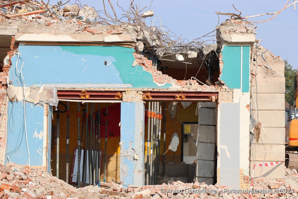 De wandschildering van Jan van der Zee uit 1958 in de oude LTS / Winkler Prins in Veendam is sinds dinsdag een zelfstandige muur. Sloopaannemer Revoort b.v uit Tweede Exloërmond heeft het schoolpand om de wandschildering inmiddels gesloopt. De verwachting is dat vrijdag (6-9) het schoolgebouw aan de Pinksterstraat verleden tijd is.