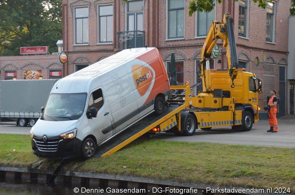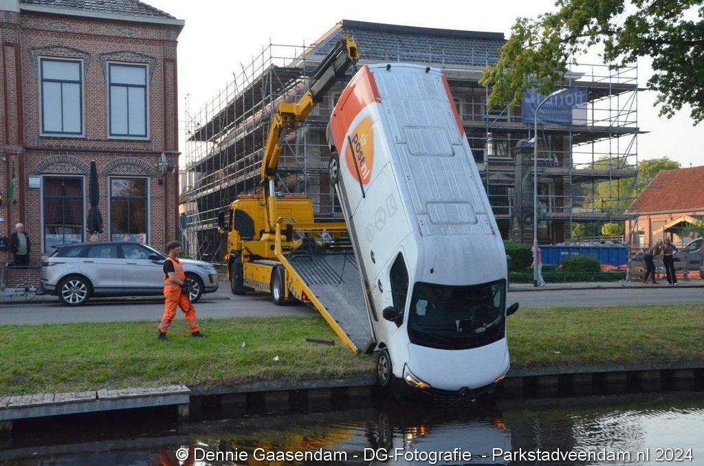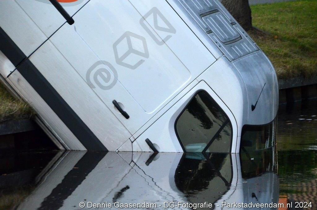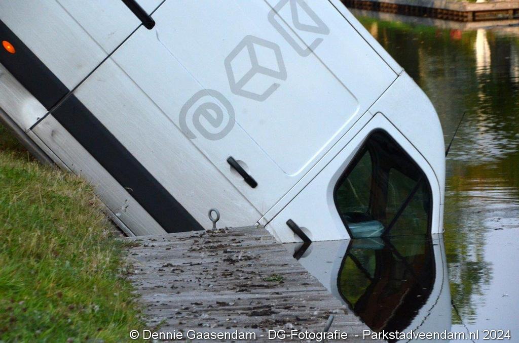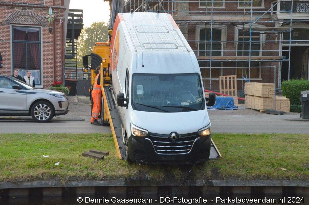 De bestelbus die op een oprit geparkeerd stond rolde spontaan van de oprit, de weg over en het water in. Een berger komt ter plaatse om de bestelbus op het droge te hijsen