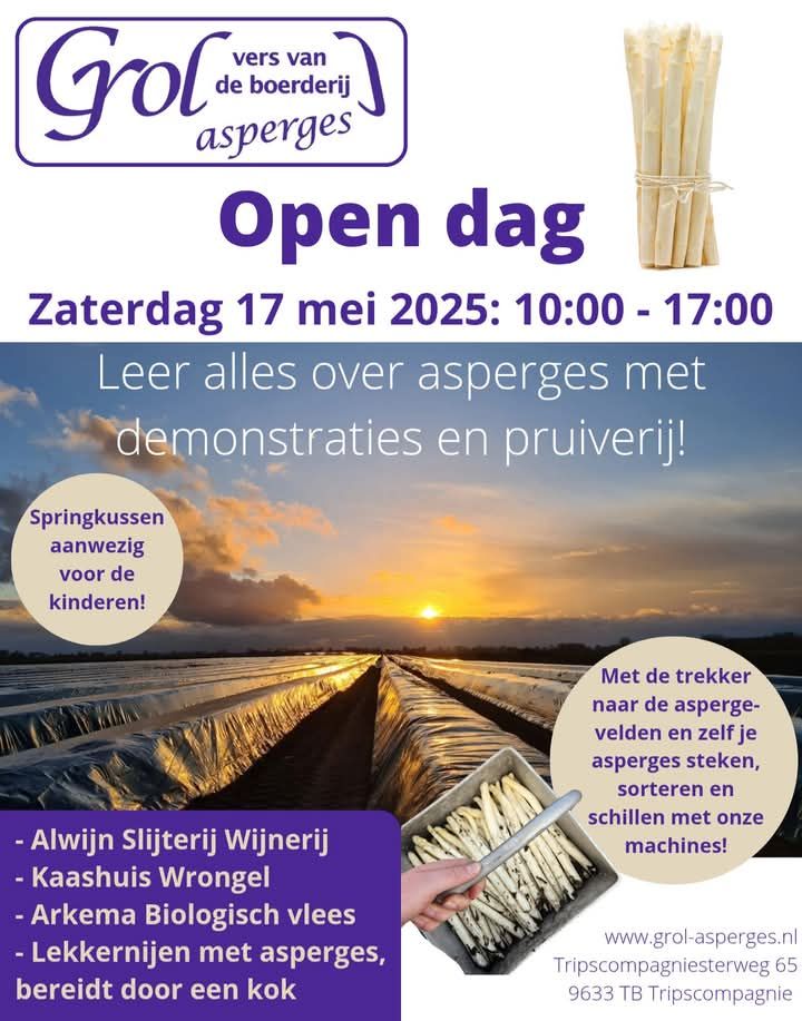 Agenda Open dag Grol asperges Door Hoofdredactie op vrijdag, 16 mei, 2025 - 09:44 Datum zaterdag, 17 mei, 2025 - 10:00 - zaterdag, 17 mei, 2025 - 17:00
