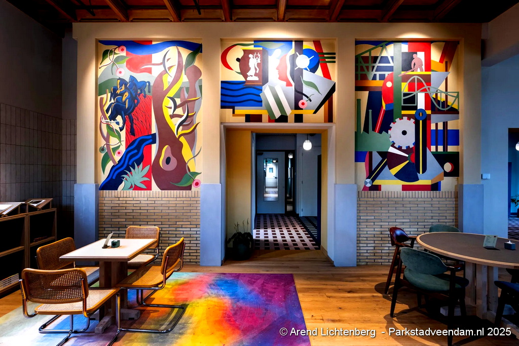 Het Kunstcentrum De Ploeg in Wehe-den Hoorn in Groningen opende begin juli de deuren. De muur van kunstenaar Jan van der Zee heeft een prominente plek gekregen in het grand cafe In het Kunstcentrum. De muurschildering met daarop drie afbeeldingen was onderdeel van het voormalige Winkler Prins school in Veendam.
