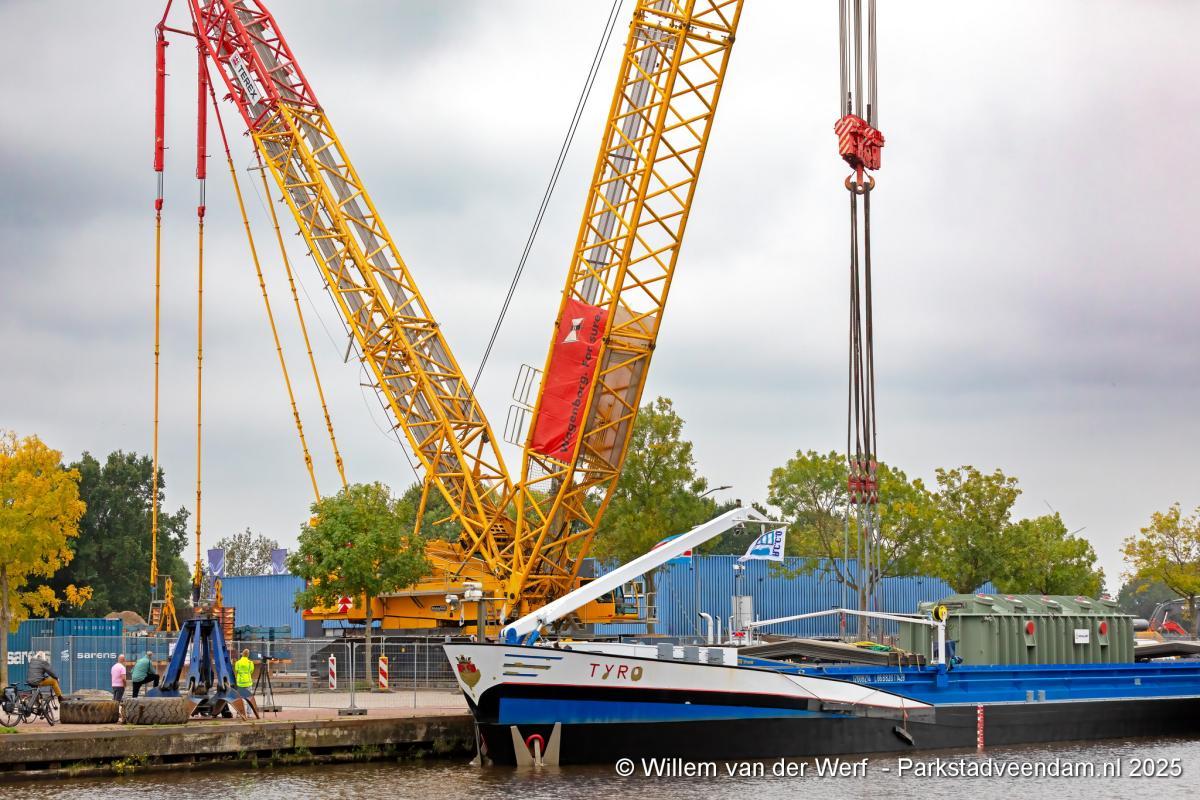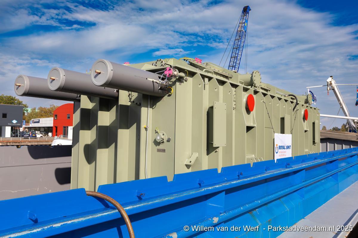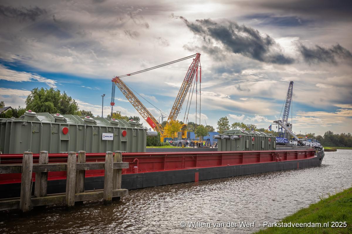 Indrukwekkend transport dinsdagmiddag in de haven aan de Adriaan Tripweg in Veendam. Met het binnenvaartschip TYRO zijn twee hoogspanningstransformatoren aangekomen, elk met een gewicht van 312,7 ton.