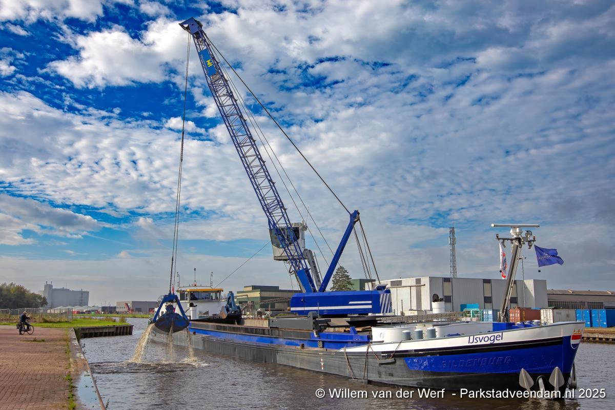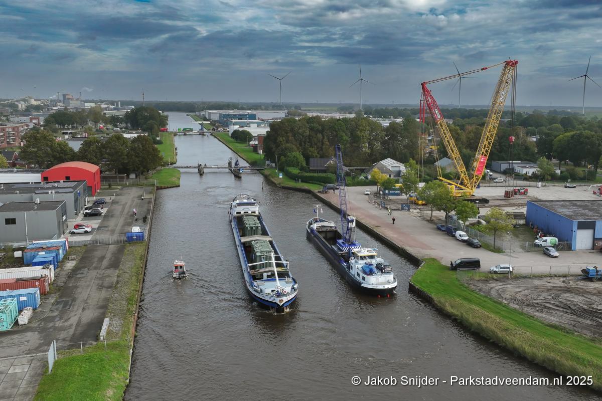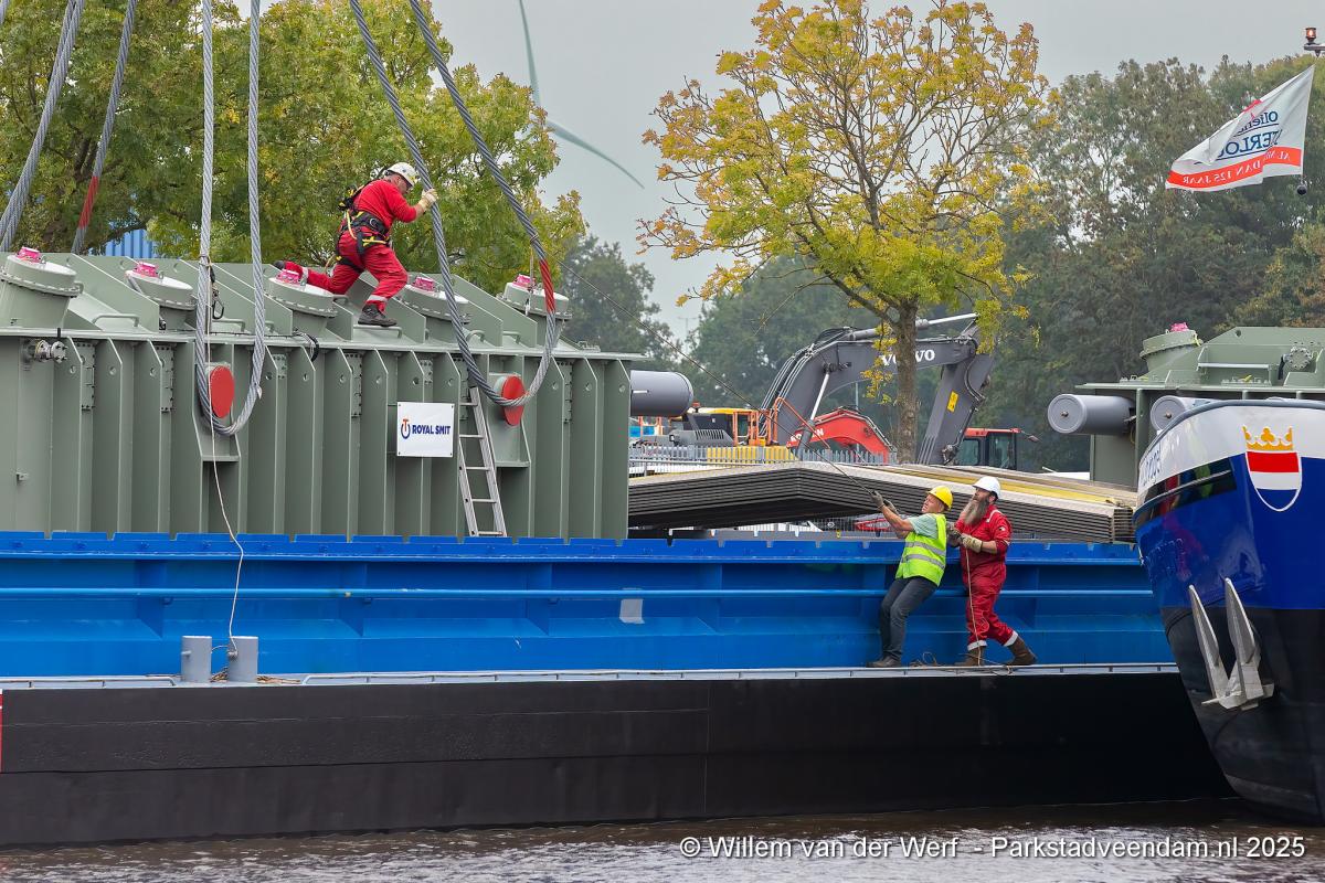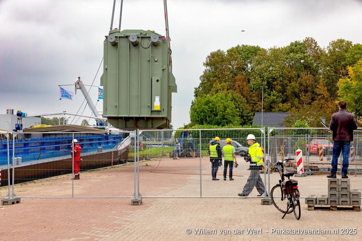 Indrukwekkend transport dinsdagmiddag in de haven aan de Adriaan Tripweg in Veendam. Met het binnenvaartschip TYRO zijn twee hoogspanningstransformatoren aangekomen, elk met een gewicht van 312,7 ton.