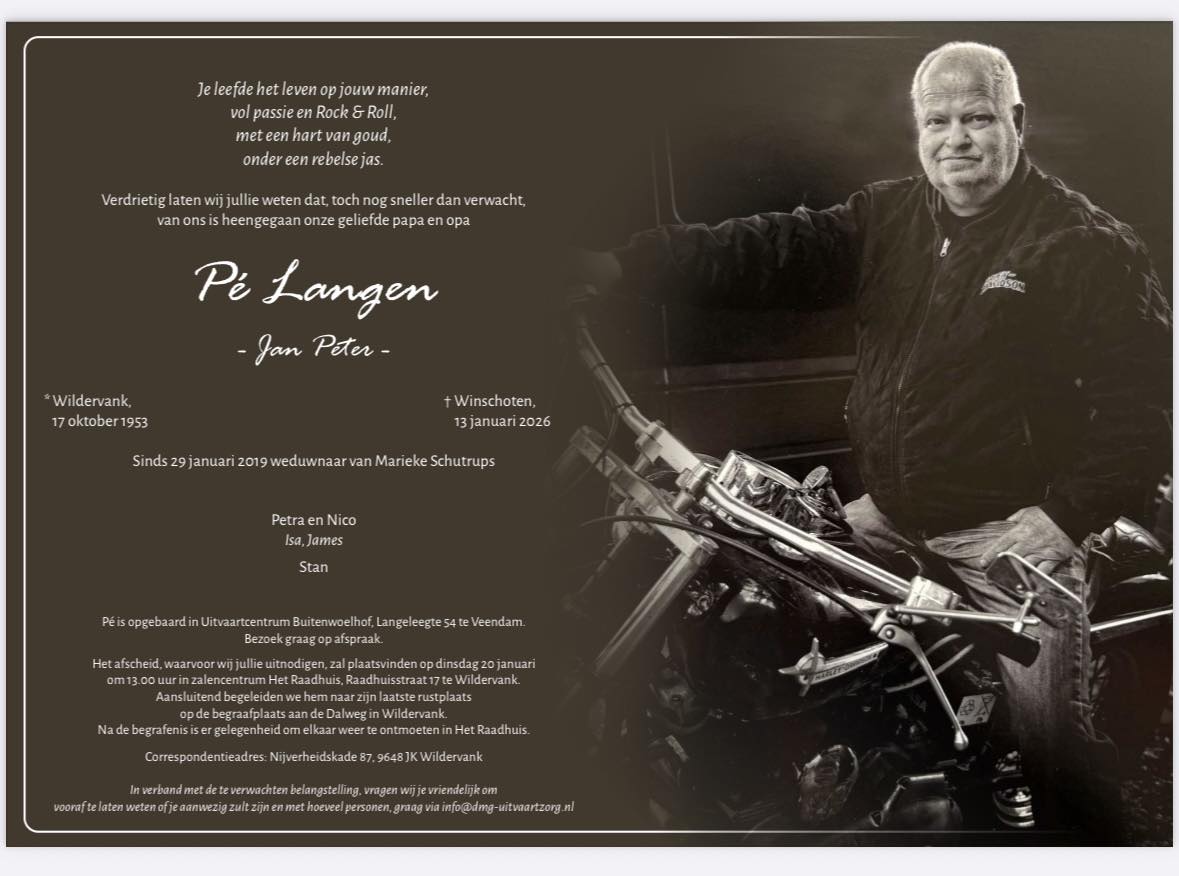 Wildervank verliest met Pé Langen een markante persoonlijkheid, iemand die jarenlang kleur gaf aan het lokale leven. Pé was een man die niet langs de zijlijn stond, maar zich steeds opnieuw inzette voor de gemeenschap, gedreven door een groot hart en een nog grotere betrokkenheid.