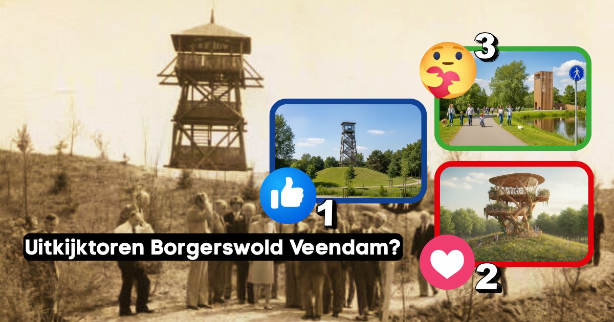GemeenteBelangen Veendam heeft drie inspiratie‑ontwerpen gepresenteerd voor een mogelijke nieuwe uitkijktoren in Borgerswold. De partij vraagt inwoners om hun favoriete variant te kiezen en koppelt daar een winactie aan, waarbij deelnemers kans maken op een cadeaupakket van de Zuivelhoeve ter waarde van circa €25 tot €40.