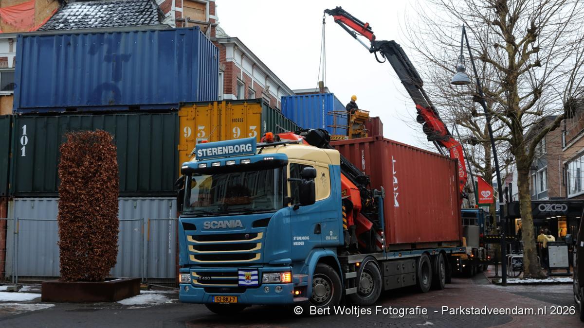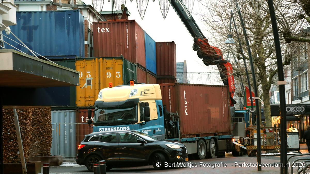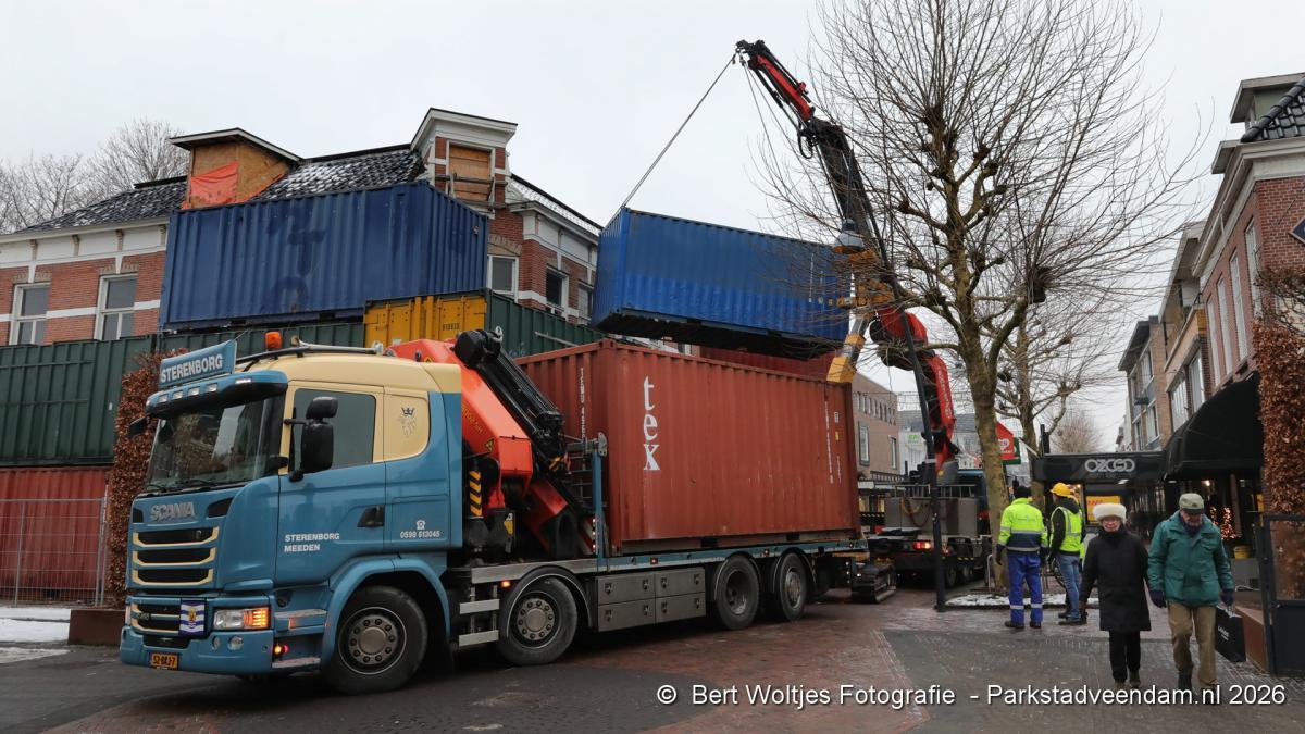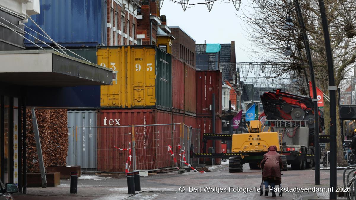 In de Kerkstraat is donderdagmiddag opnieuw gewerkt aan de afzetting rond het voormalige pand van Hensen Bedden. Boven op de twee bestaande lagen containers werd een derde laag geplaatst om de veiligheid rondom het pand verder te vergroten.