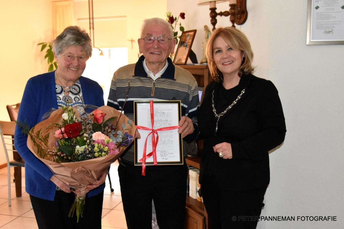De heer en mevrouw Hanzen uit Veendam vieren vandaag hun 65‑jarig huwelijk. Burgemeester Annelies Pleyte bracht het echtpaar een bezoek om hen namens de gemeente Veendam persoonlijk te feliciteren. Zij overhandigde een bloemetje en een kopie van de originele trouwakte.
