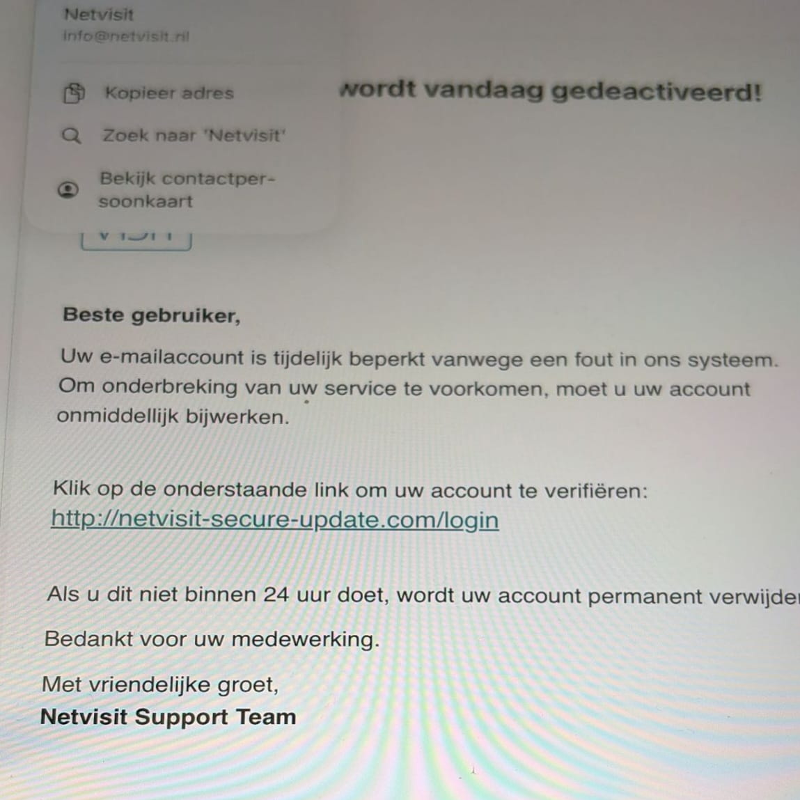 Er circuleert momenteel een phishingmail die zich voordoet als een bericht van SKV/Netvisit. In deze e‑mail wordt onterecht beweerd dat uw e‑mailaccount tijdelijk is beperkt en dat u binnen 24 uur actie moet ondernemen om verwijdering te voorkomen.